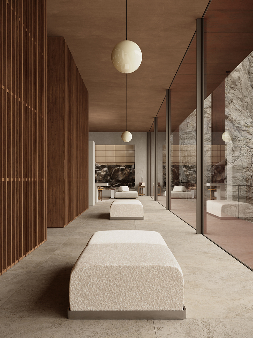 Sand floors, reminiscent of traditional Japanese gardens, fill the tea room and relaxation area in the bedroom. Meanwhile, a Japanese-style lantern with a light fixture hangs in the tea zone. ‘The natural finish materials and warm color palette of the interior contrast with the cold stone exterior, enhancing the cozy effect inside. Glass House is a project that represents my creativity and style as an artist while also showcasing my architectural design skills,’ concludes Kseniia Kolesnikova.