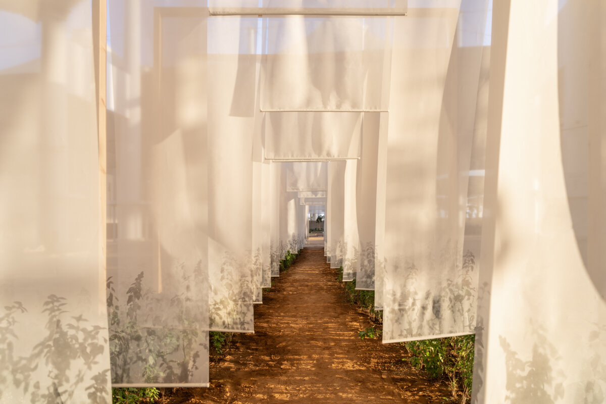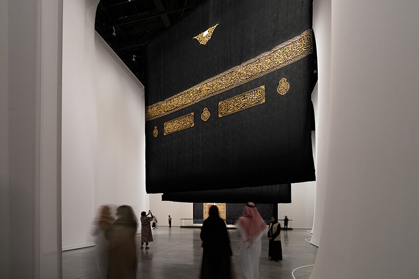 The journey begins with works that symbolize crossing physical and metaphysical thresholds into spaces of transformation. Fatma Abdulhadi’s I Wish You in Heaven is a surreal passageway celebrating life while mourning the deceased. Integrating an olfactory element, Abdulhadi explores the idea of ​​family heirlooms and the Quranic significance of plants, suspending translucent tapestries marked with ghostly imprints of basil leaves. ‘My mother used to tell me that in the Quran, it says that basil is the scent of Jannah (paradise),’ the artist tells designboom.