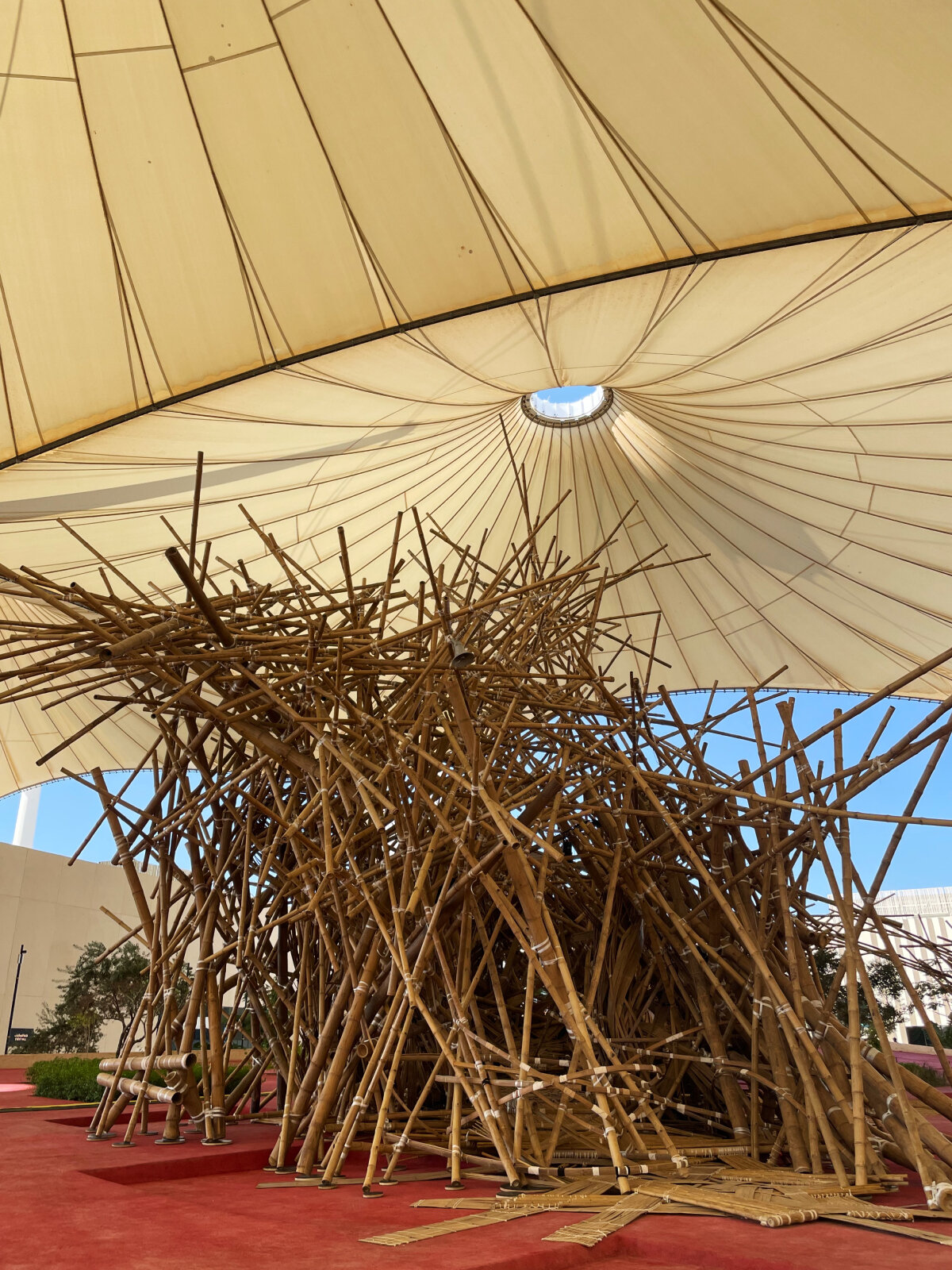 The Pakistani artist realizes a tranquil oasis of waterways dividing verdant quadrants where visitors to the biennale can wander, gather, or lay down on the expansive charpai — a sprawling iteration of the traditional bed from rural South Asia, woven using artisanal techniques also employed by Yousefzada. In this age of technology, there is a segregation between these traditional crafts,’ the artist tells designboom as he reflects on the contribution of the artisans who helped him to weave his work. ‘It’s important to preserve them, but also to consider how they can take new shape.’ Similarly, Asim Waqif’s collaborative sonic installation revitalizes vernacular forms and crafts to address concerns about their future, endangered by contemporary technologies. With Min Rukam, he assembles bamboo harvested in India into an immersive cocoon, braided with traditional basketry techniques on an architectural scale. Interactive, the work invites all to step over the bamboo and tap the walls to together generate an improvised yet intentional soundscape.