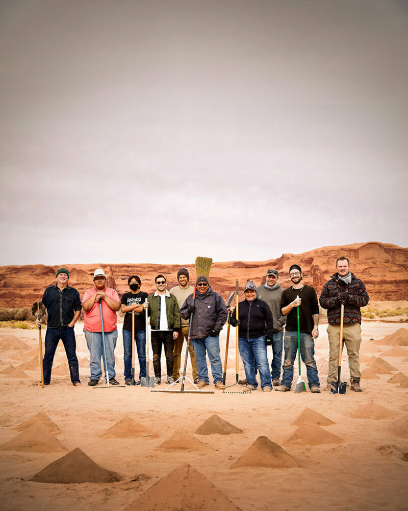 It took 20+ people seven days, working every day from sunrise to sunset, to build the 300 foot wide land art. The build team was made up of local Navajo artists, Jim and Brighton Denevan, as well as their team, who traveled to Navajo Nation from across the country.