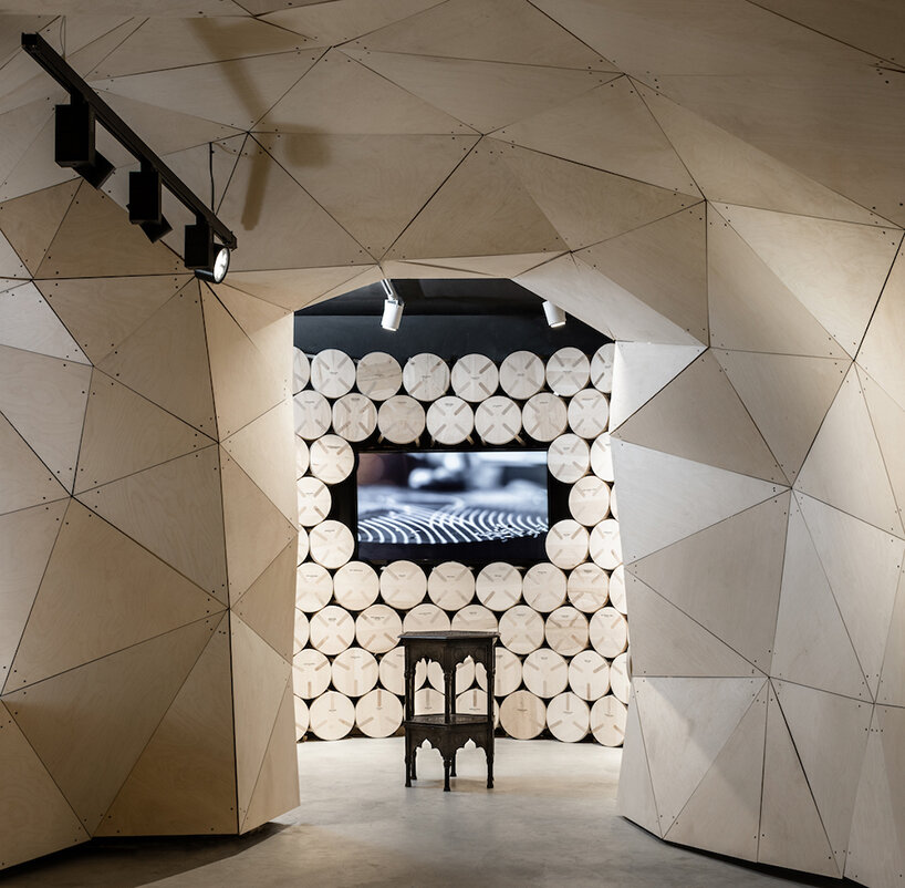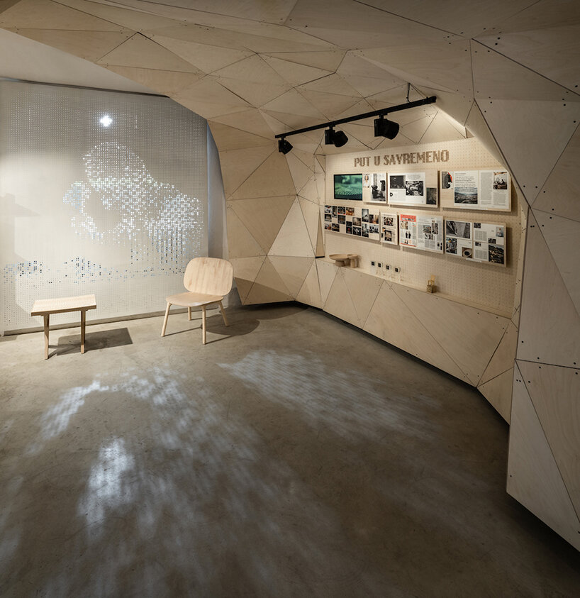 The resulting layout features tunnel openings that host panels with multimedia exhibitions, each telling the story of Konjic woodcarving across different periods. Additionally, an installation wall made of 220 Tattoo stools designed by renowned Wingårdhs architects serves as a memorial room to deceased woodcarvers from the past four generations.