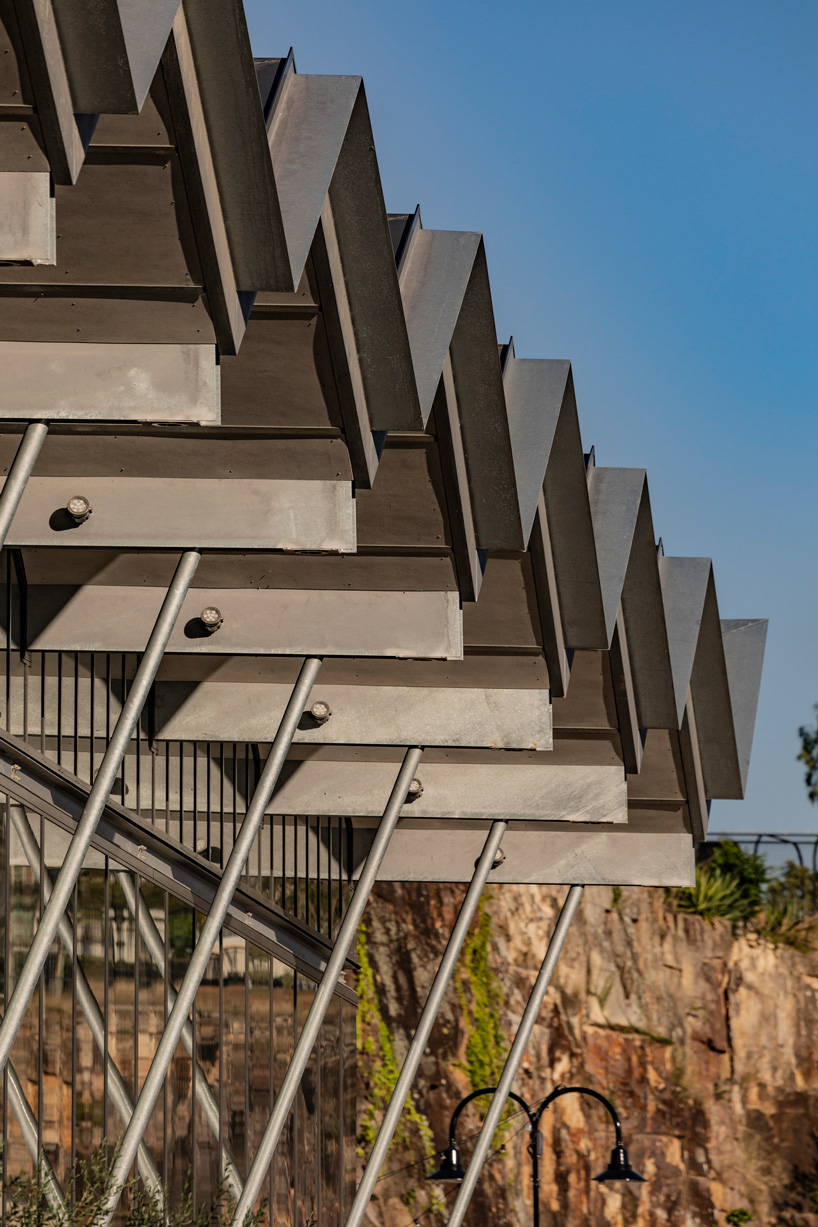 creating a stronger connection to country the cantilevered feature gallery is entirely outdoors and structural columns appear to grow from out of the ground