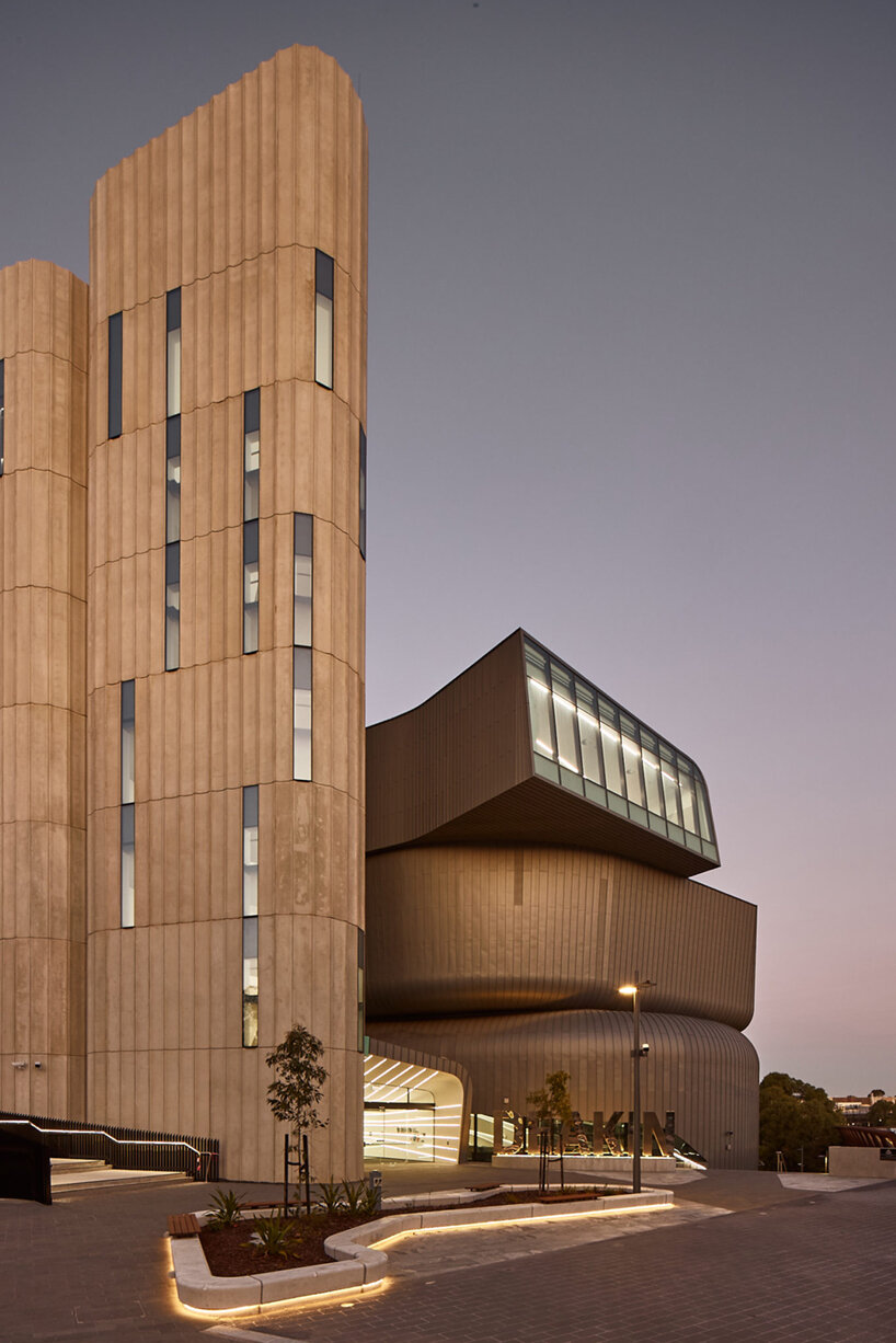 grounded on kaurna land, the design of the 11,500 square meter (123,785 square foot) building originates from the aboriginal conception of the elements that link us to place: earth, land, and sky. the design team explains that the narrative for the building is based on the deep aboriginal connection to country, place, and kin, with connected layers being the foundation of the design.