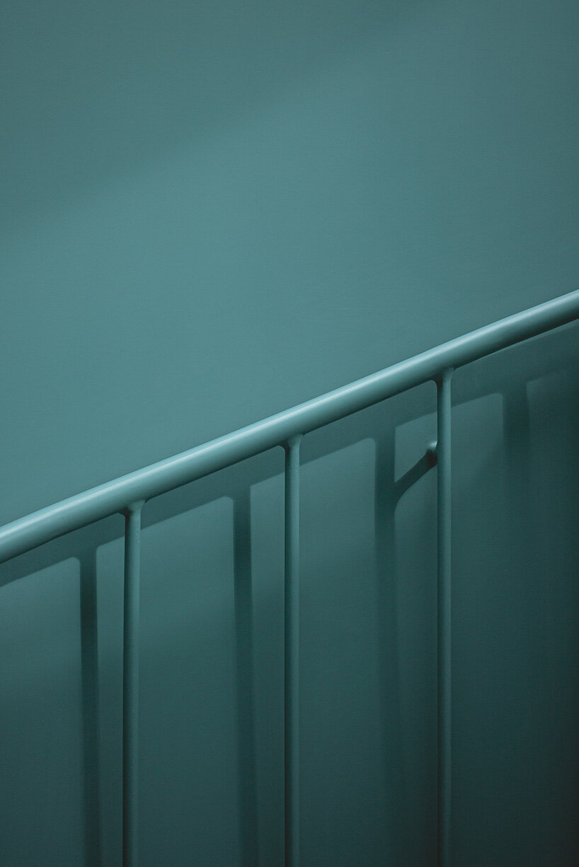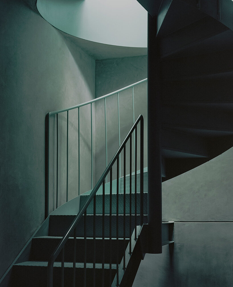 The material palette reinforces the spatial mood. A muted green saturates the metal elements, stairs, railings, doors, and furniture, while textured gray plaster walls create a neutral backdrop and allow these features to pop.