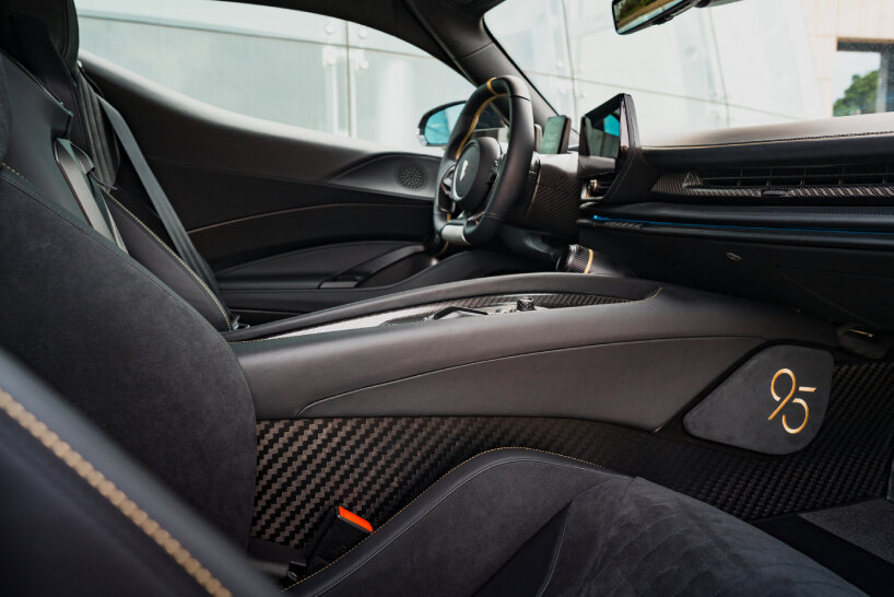 For the seats, the design team uses black leather and black Alcantara, a synthetic material that feels like suede. The seats have stitching in two colors: black and gold. This style matches the car’s exterior colors, with the gold line around the lower panel of the doors as well as the exposed signature carbon. Even the knee pads use black Alcantara, and they bear the logo ‘95’ engraved in gold to recall the name of the model.