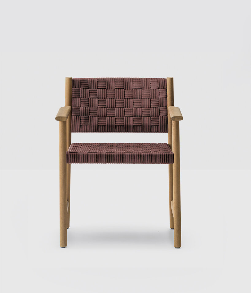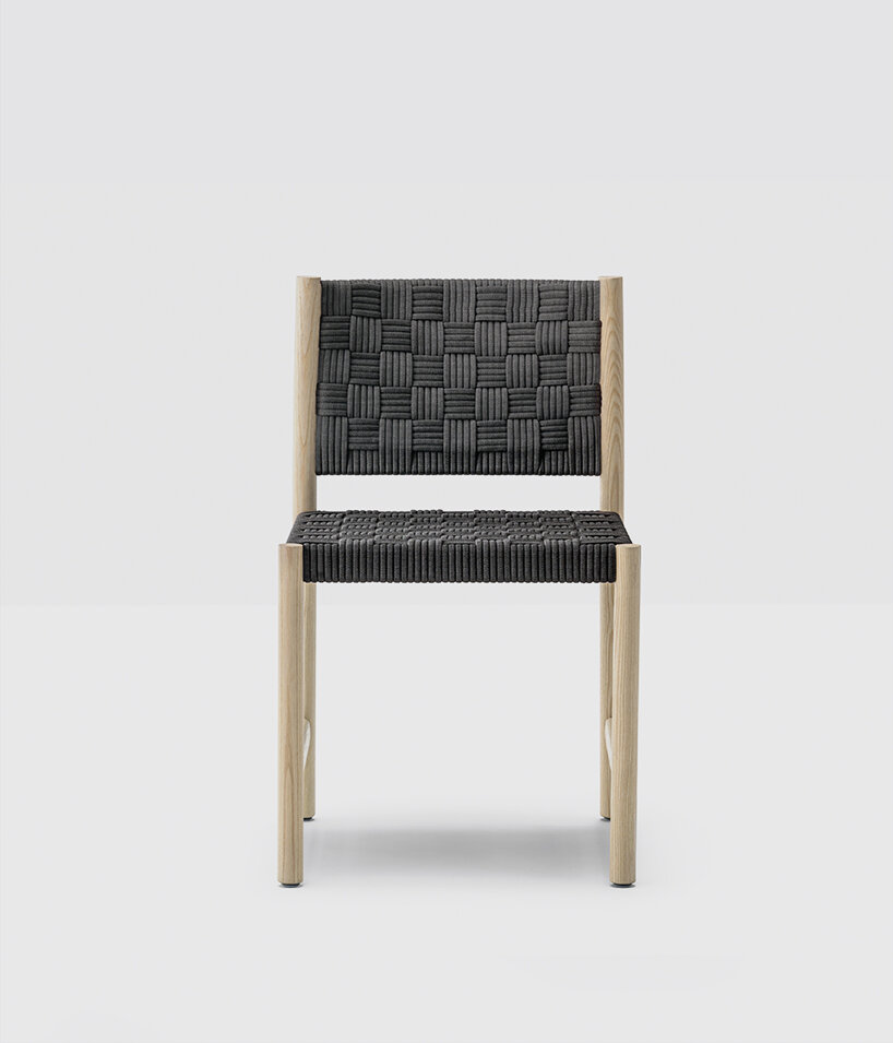 ‘The Griante project was conceived from the start as an outdoor chair, stemming from a line of research we began with Guinea, where we explored the possibilities of creating outdoor seating with wooden components. Unlike Guinea, Griante is made entirely of wood, with the seat and backrest in aluminum handwoven with polypropylene yarn belt. This of course results in lightweight, weather-resistant, rust-proof elements, suitable even for marine environments,’ explains the design studio.‘The light tone of ash wood, combined with the natural, lively irregularities of teak, softens the formal rigor that defines both the chair’s shape and its woven pattern. It reconnects us with something ancient and universal, shared across cultures. There’s a special pleasure in the touch of wood — a sense of completeness that doesn’t need embellishment or technical virtuosity. The woodworking is simple and minimal: cylindrical turned legs and an elliptical-section armrest, soft in its restraint.’