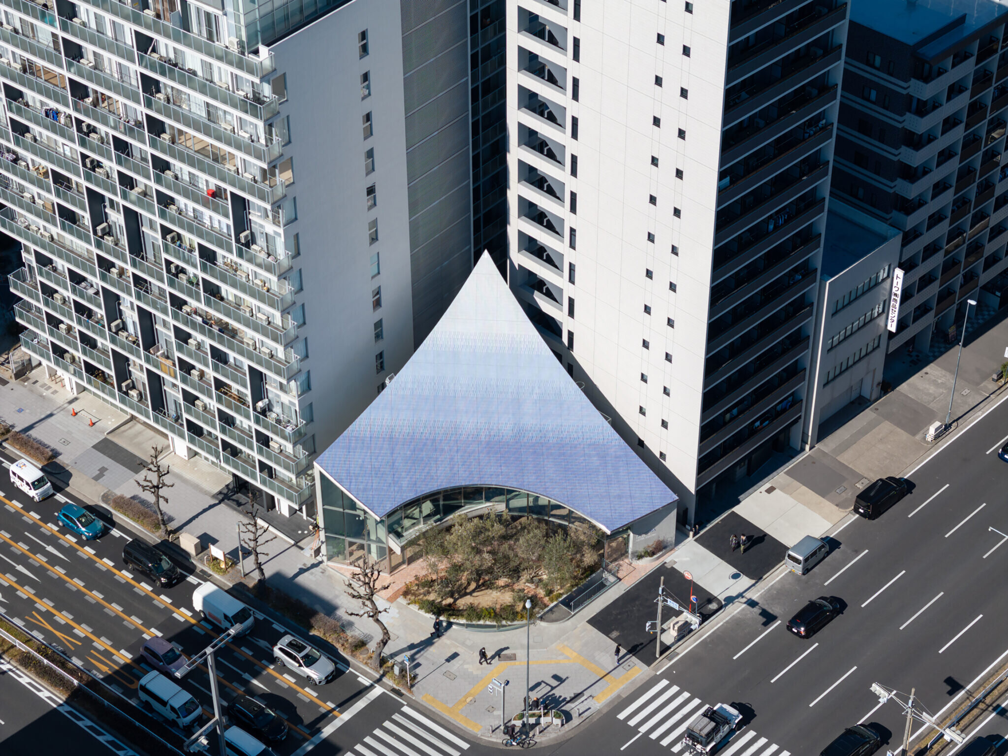 A sweeping roof clad in 28,000 blue-gradient tiles, sparkling like ripples in water, gently rests atop the AOI Celestie Coffee Roastery in Japan. Perching the café on a bustling urban corner surrounded by high-rise residences and across from a station, Yuko Nagayama & Associates has anchored a mixed-used complex with a new neighborhood landmark. The structure is set back from the street front with a curve containing a verdant courtyard with an olive grove, forming what the architects describe as a ‘white space’ within the city — symbolically creating a moment of calm and visually softening the engulfing urban density with organic rhythms of light, nature, and material care.