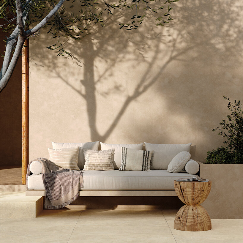 Armonie Pietra offers a graphic, architectural counterpoint. Four stone variations — Pietra Madrid, Fontainebleu, San Just, and Pietra del Chiostro — are available in multiple sizes (from 120×120 cm to 60×30 cm) and two finishes: Natural and Antislip. A thicker 20 mm version in the 120×60 cm format enhances durability for outdoor settings. The result is a versatile palette that moves seamlessly between surface applications while retaining a strong visual identity.