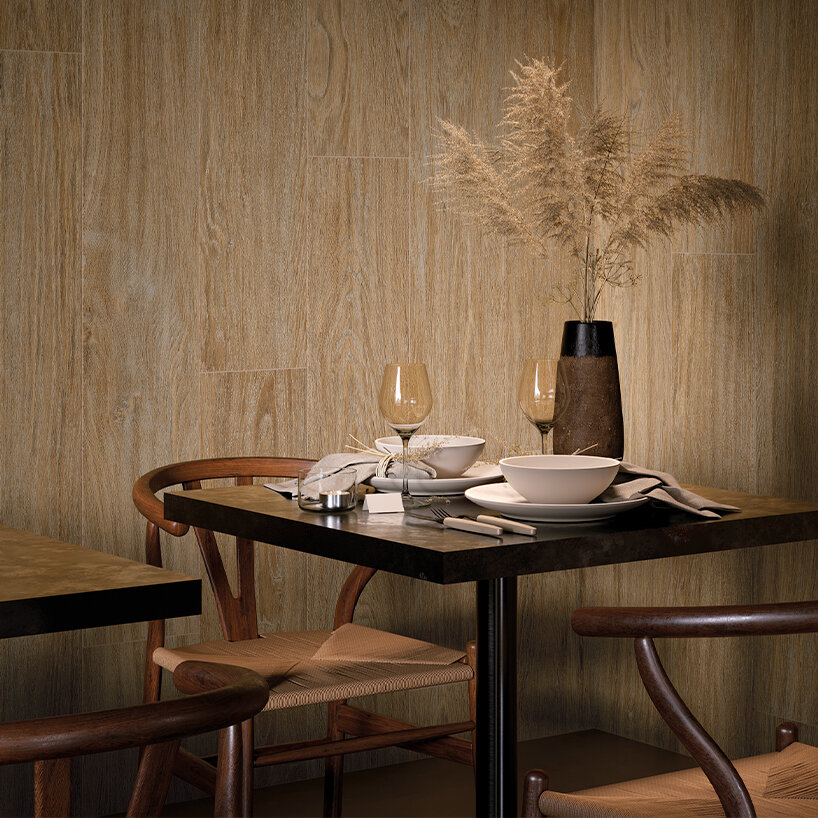 Armonie is built around the interplay of three distinct ceramic surfaces — Legno, Cotto, and Pietra — each referencing a traditional material while offering the technical advantages of porcelain stoneware.