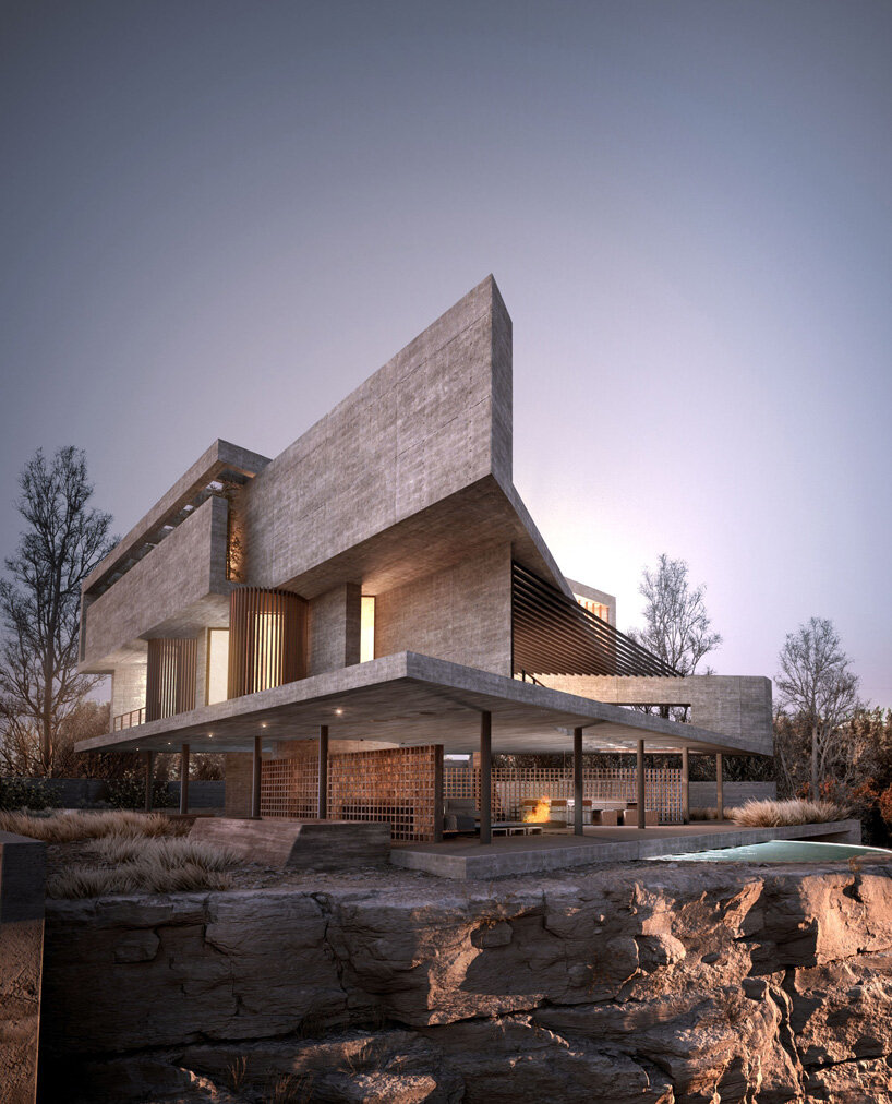 the distinction between indoor and outdoor becomes immaterial and seamless, while an architectural promenade unravels all throughout the residence. a massive presence in the landscape, the natural limestone podium gets hollowed out to define interior spaces. at the same time, the expressive materiality of the concrete slabs and the slender pilotis contribute to enhance the floating quality of the structure.