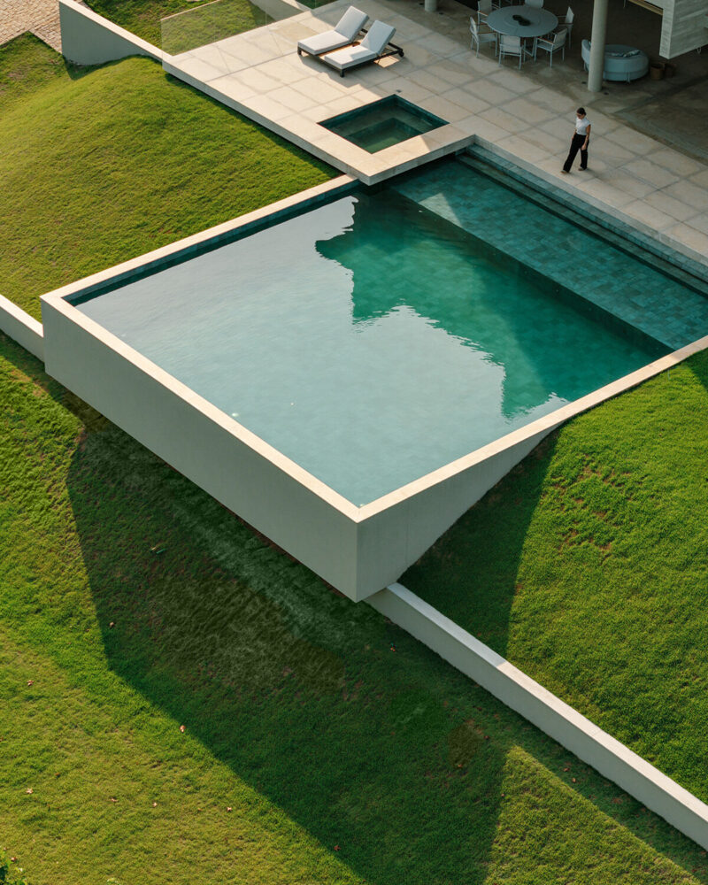 the pool is slightly elevated, creating a floating effect in the landscape