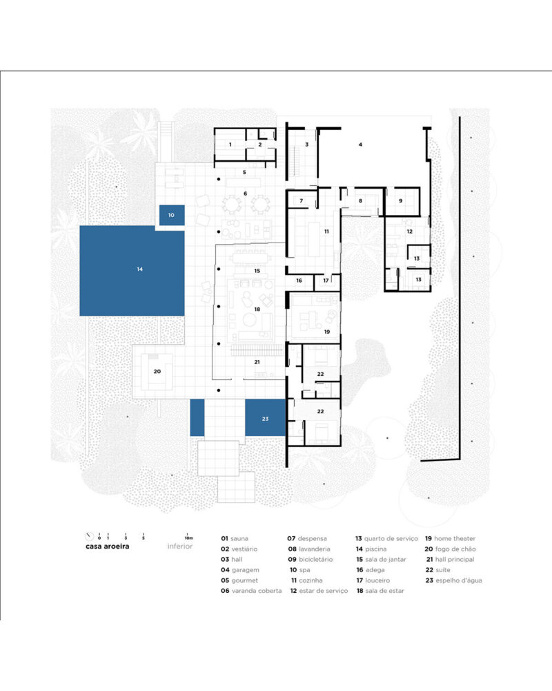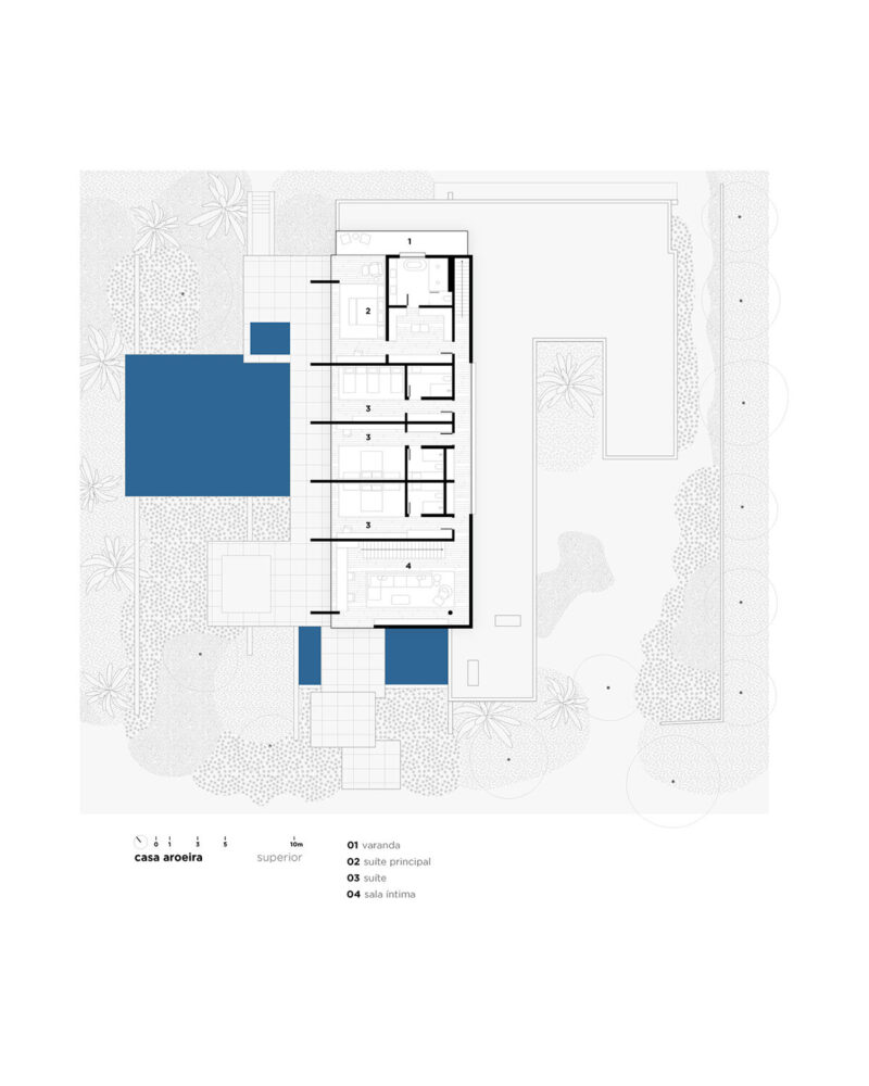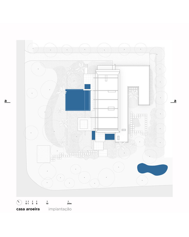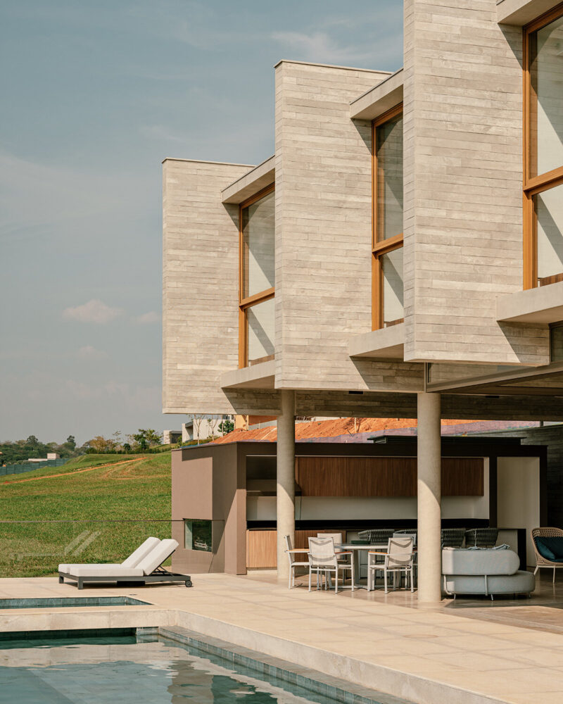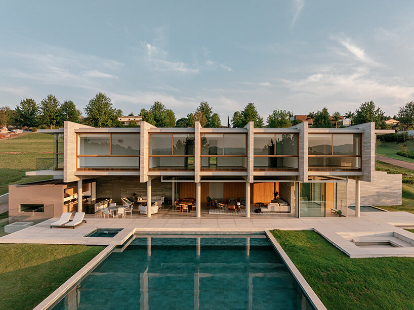 terraces, patios, and a swimming pool unfold across offset planes in response to the site’s incline