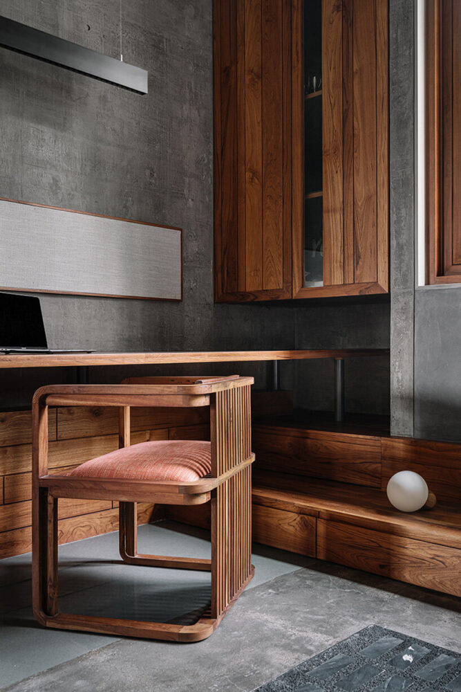 concrete and lime-plastered walls are combined with grey Kota flooring