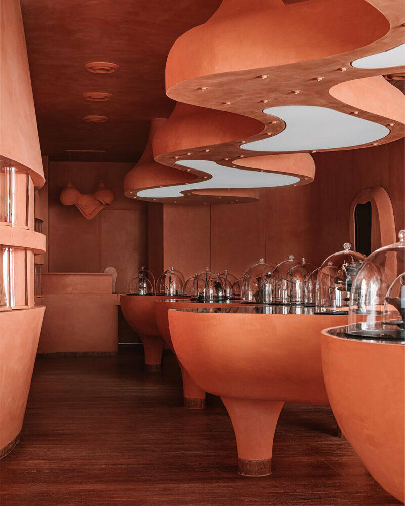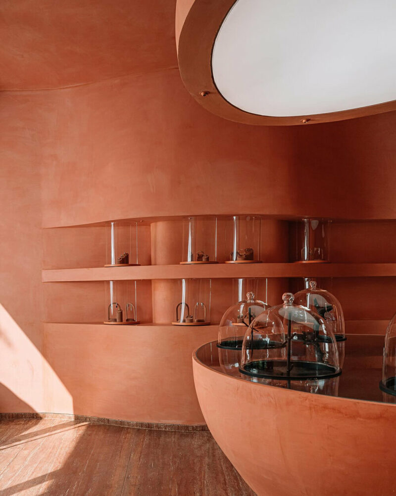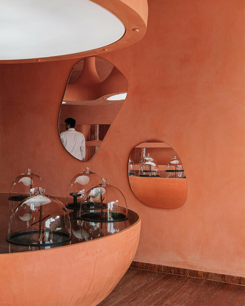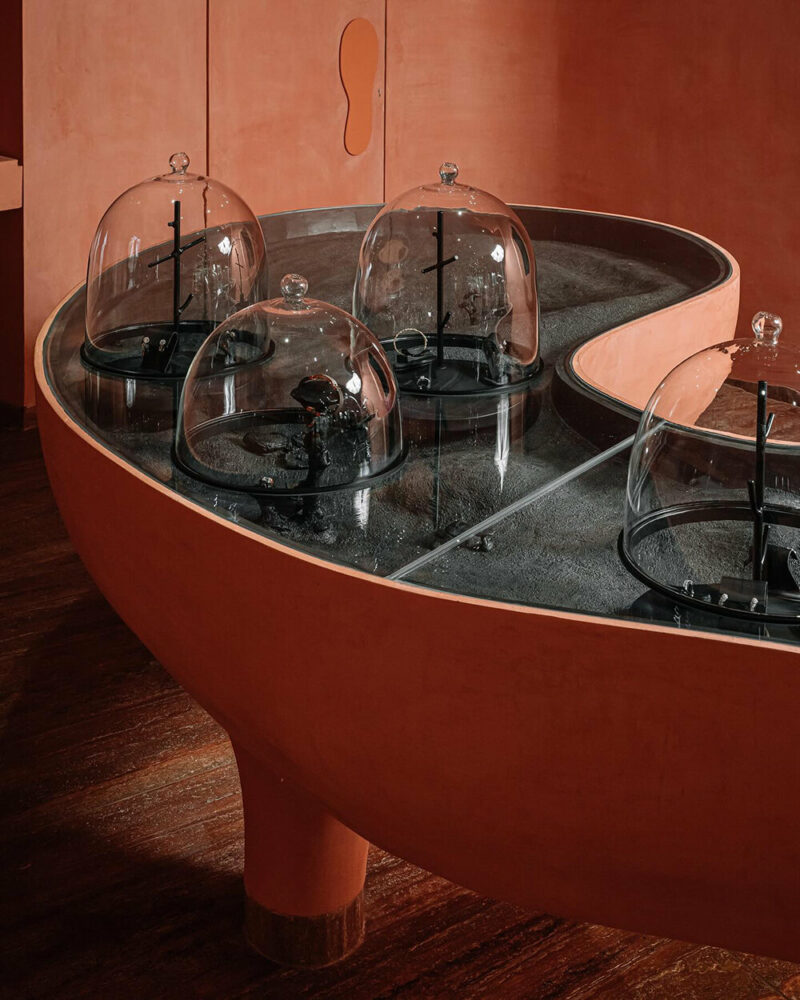 Fortune Farm is the most ambitious retail design by MuseLAB to date. Completed as the India-based studio’s first-ever jewelry store in Ahmedabad, the project alludes to a martian landscape, where peachy terracotta surfaces fold and warp around diamond pieces displayed in an island layout. ‘The idea was to create an experience of otherworldliness through a series of sensuous, textural, undulating surfaces that house the army of the ring bearers within biodome-like cloches,’ shares the design team.