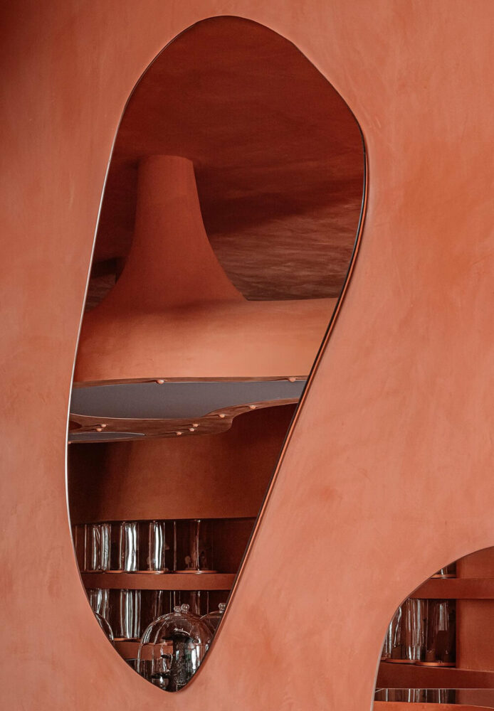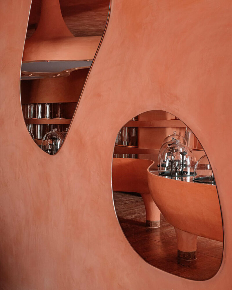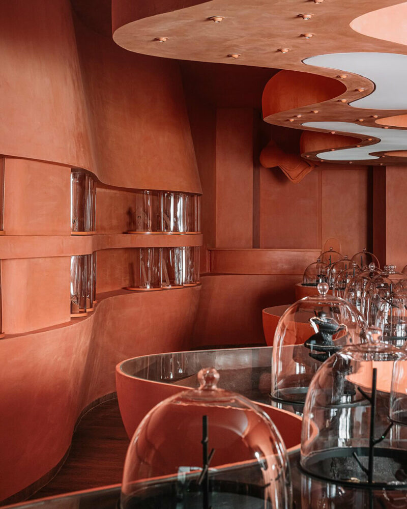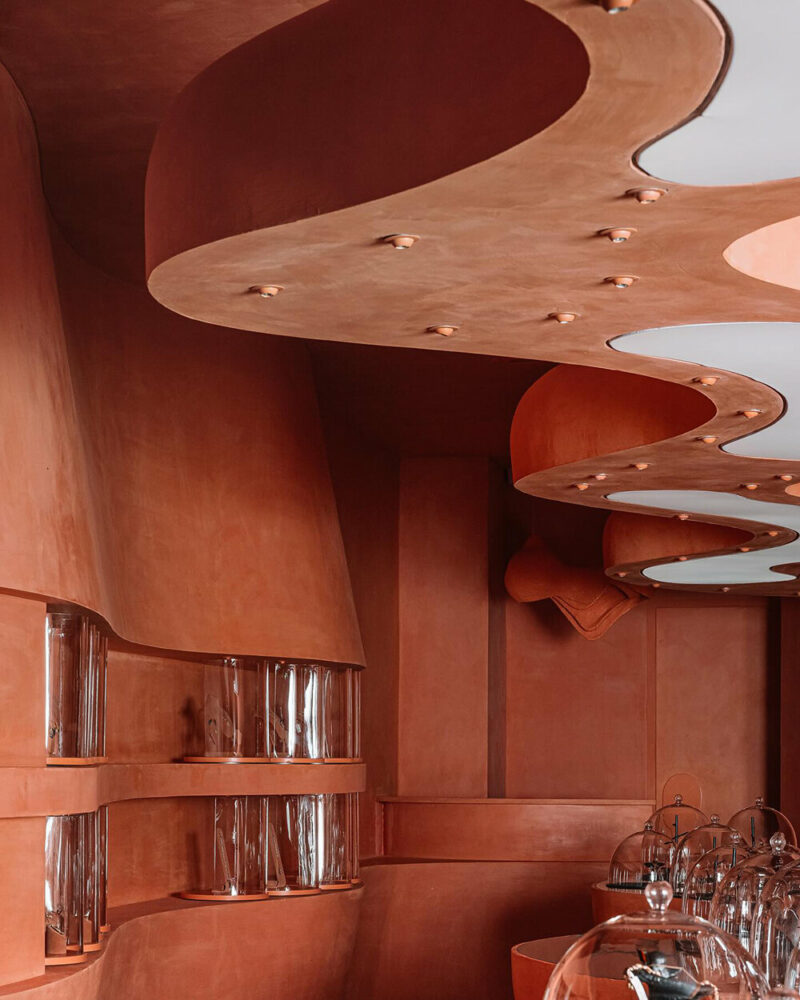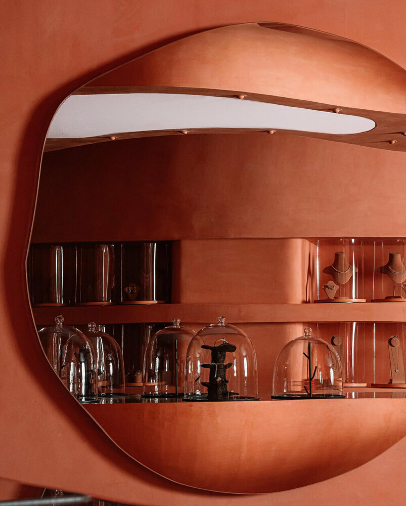 Fortune Farm is the most ambitious retail design by MuseLAB to date. Completed as the India-based studio’s first-ever jewelry store in Ahmedabad, the project alludes to a martian landscape, where peachy terracotta surfaces fold and warp around diamond pieces displayed in an island layout. ‘The idea was to create an experience of otherworldliness through a series of sensuous, textural, undulating surfaces that house the army of the ring bearers within biodome-like cloches,’ shares the design team.