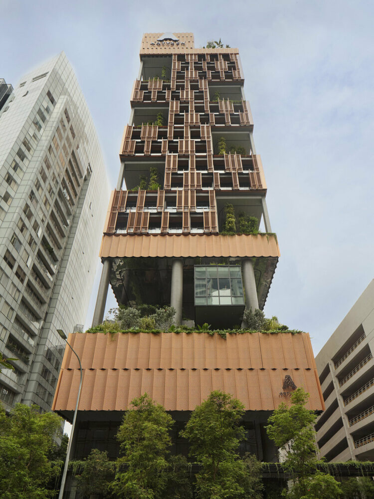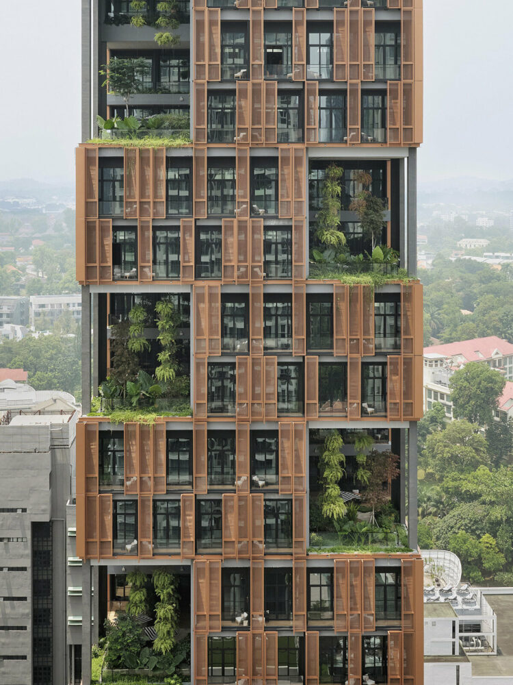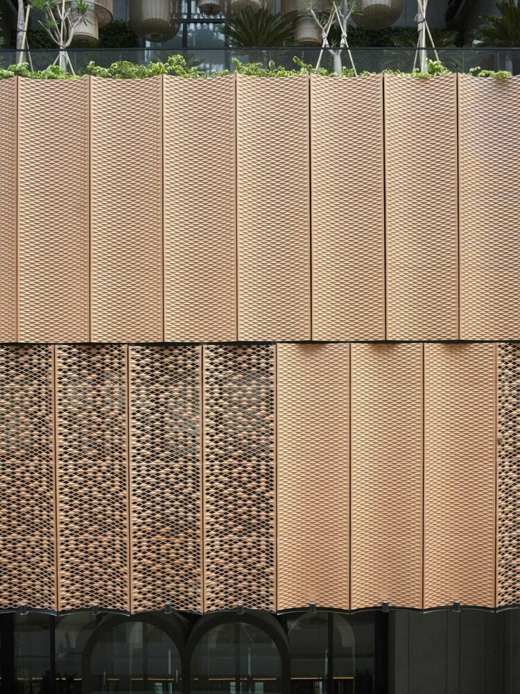 the facade minimizes solar glare with oriented openings, cast aluminum panels, and steel mesh screens