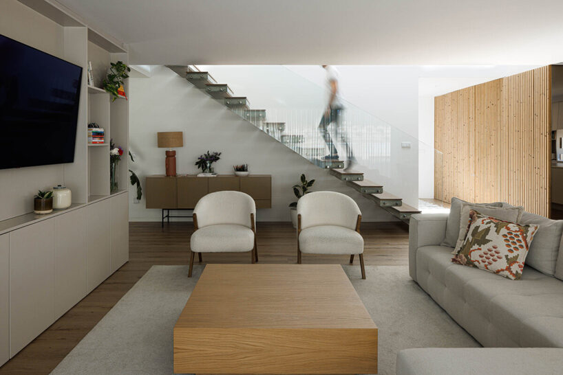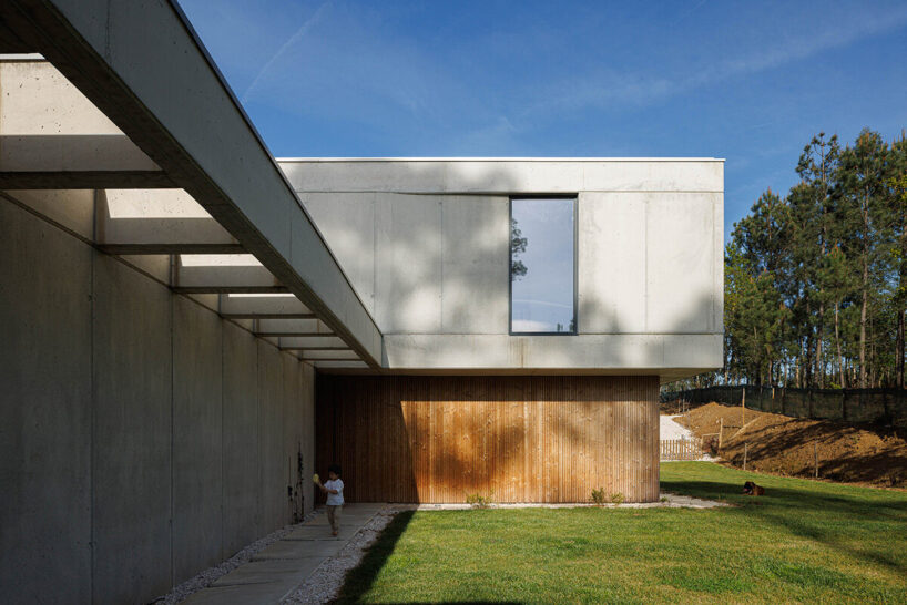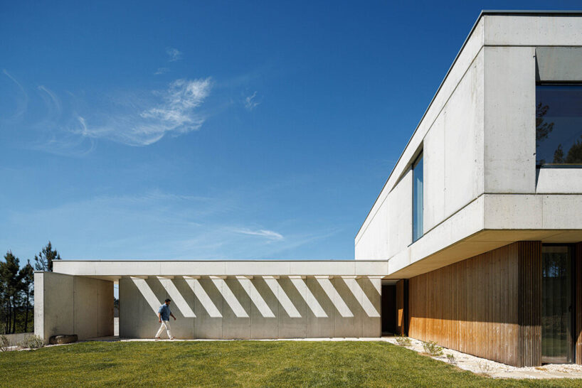 natural wood slats are used throughout, adding warmth and blending the house with the surrounding landscape