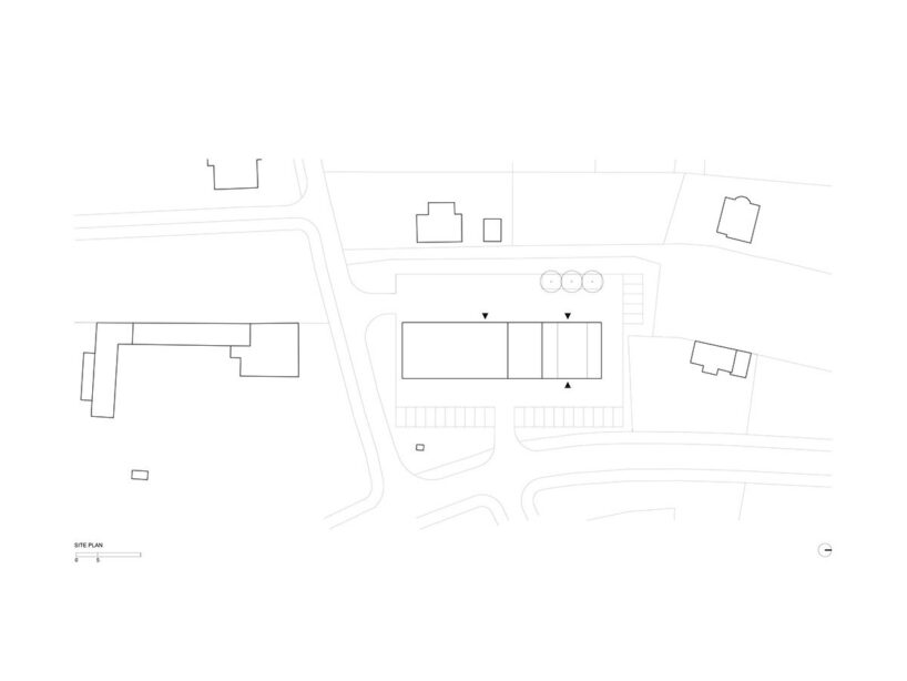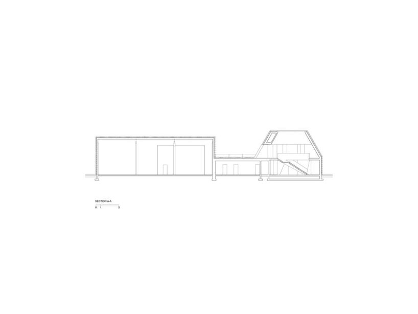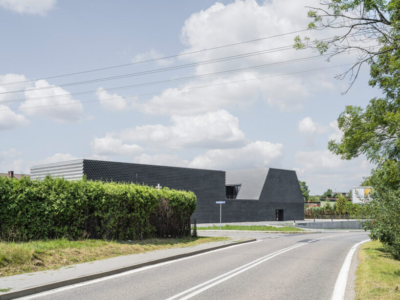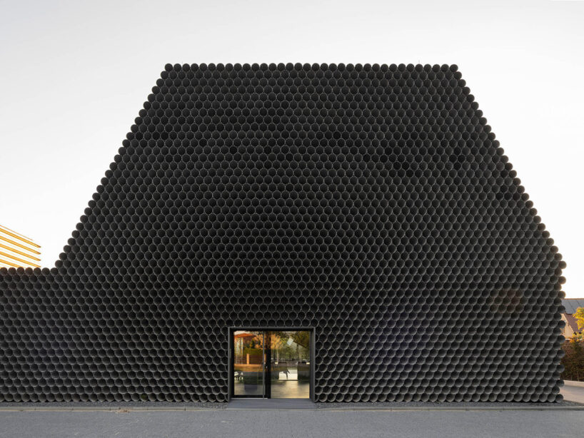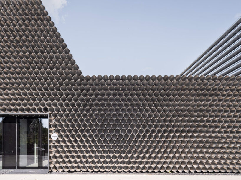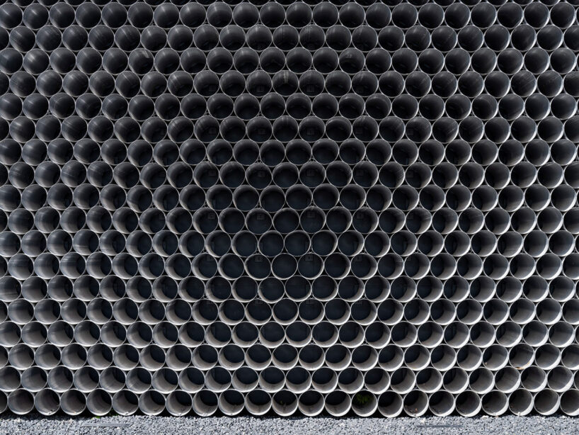 the sloped roof is shaped by the optimal angle for stacking pipes and local zoning height limits