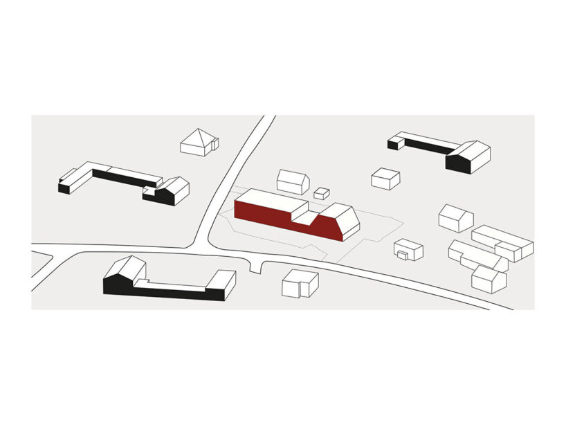 ground-floor office spaces feature large windows with views onto landscaped grounds