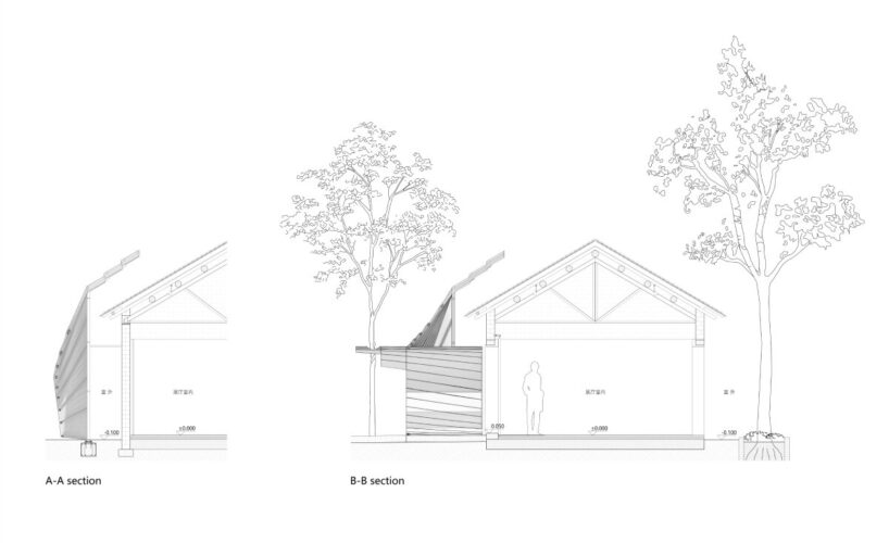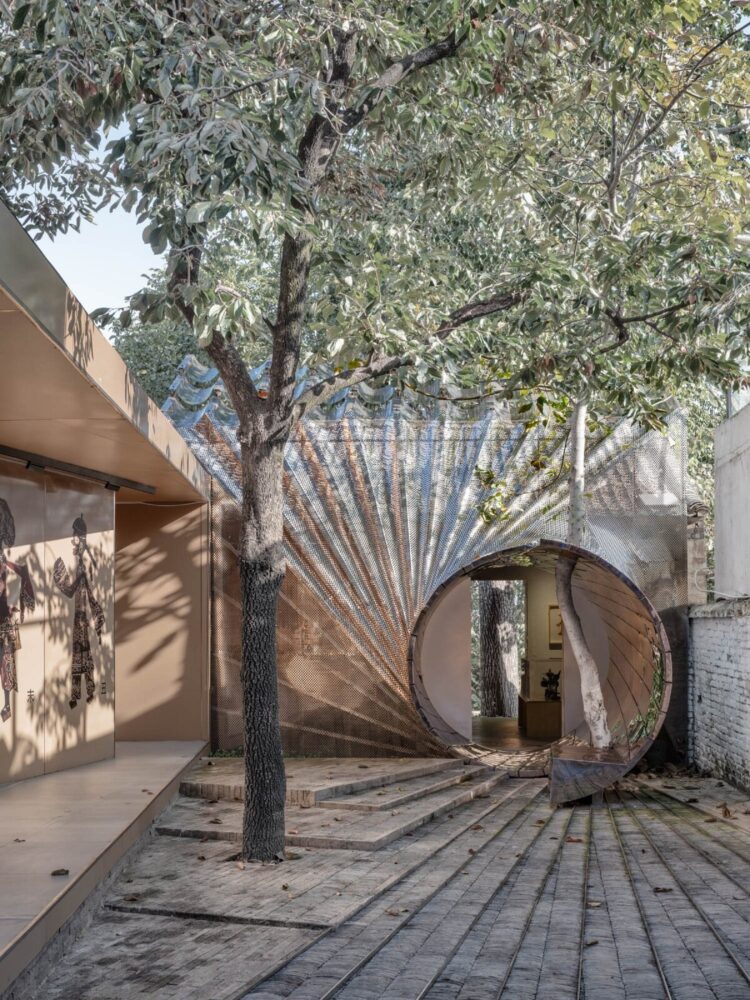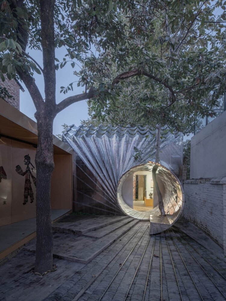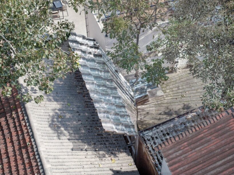 a wave-shaped perforated metal roof that draws on the flowing roof tiles of local homes