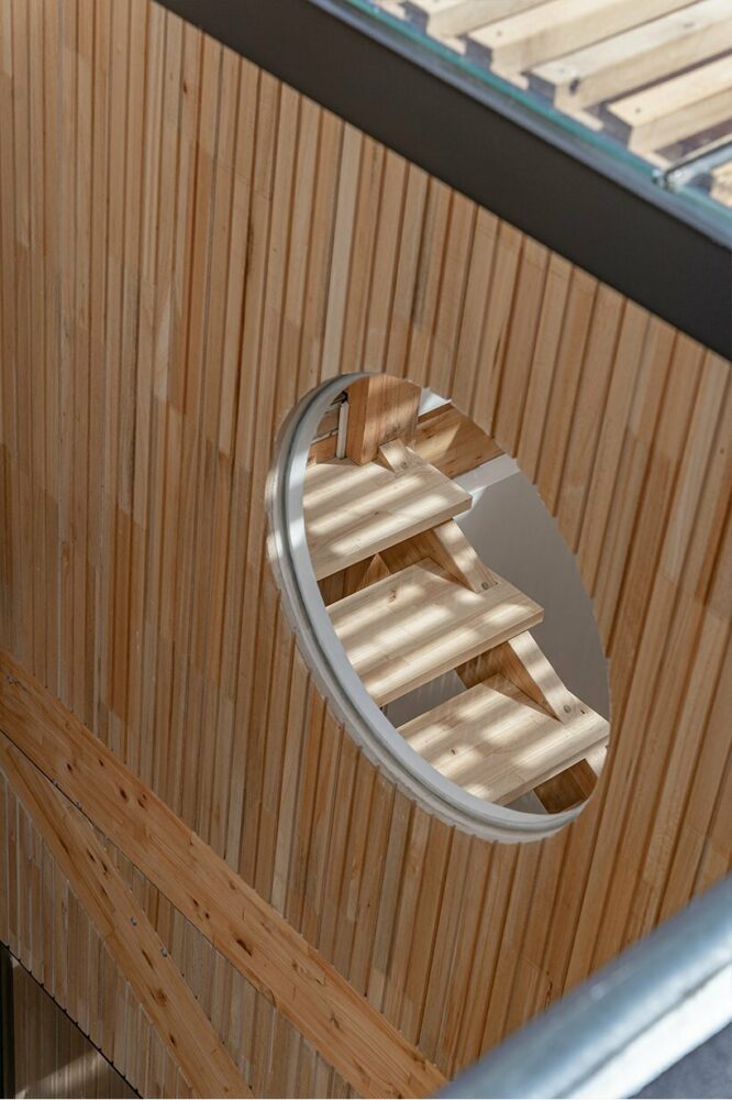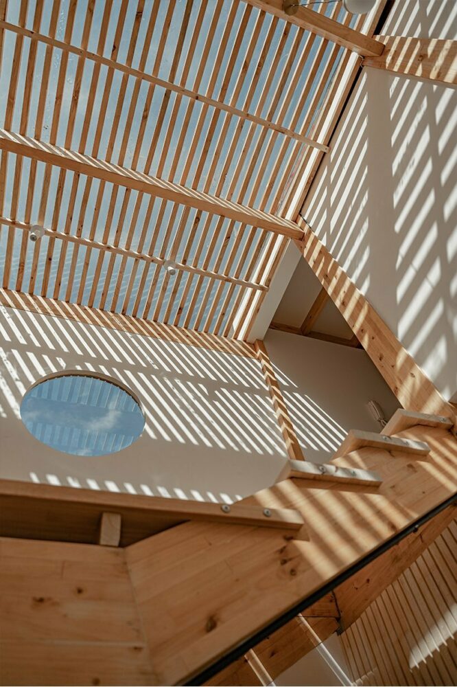 the design concept manifests in the form of two identical wooden blocks, separated by a connecting axis