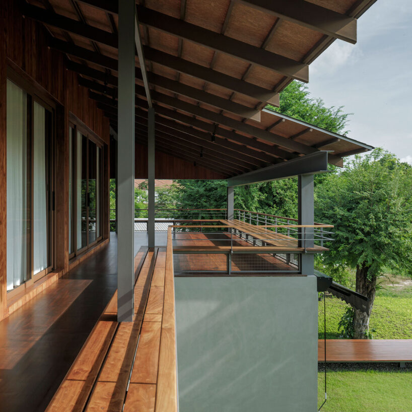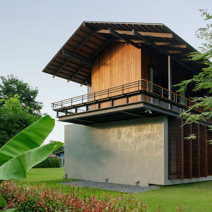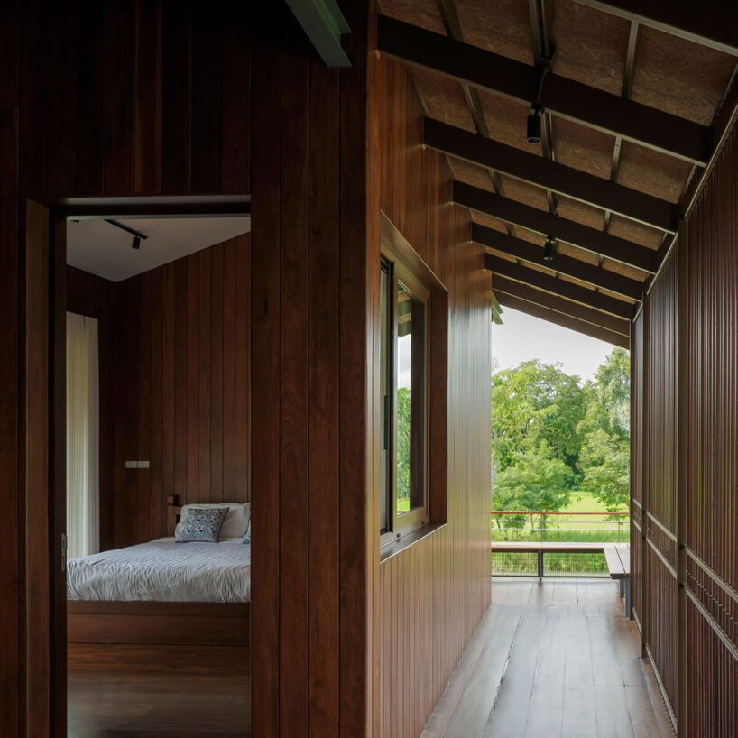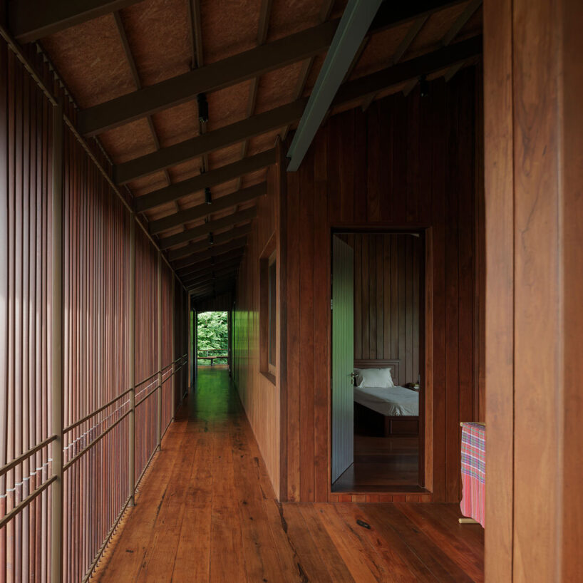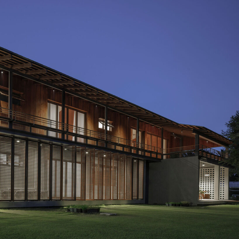 in the alloa hills of india, studio sangath's weekend home dissolves into the landscape through terracotta tones and an open courtyard plan.