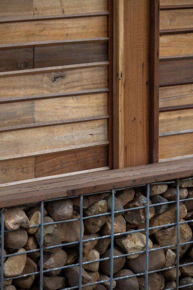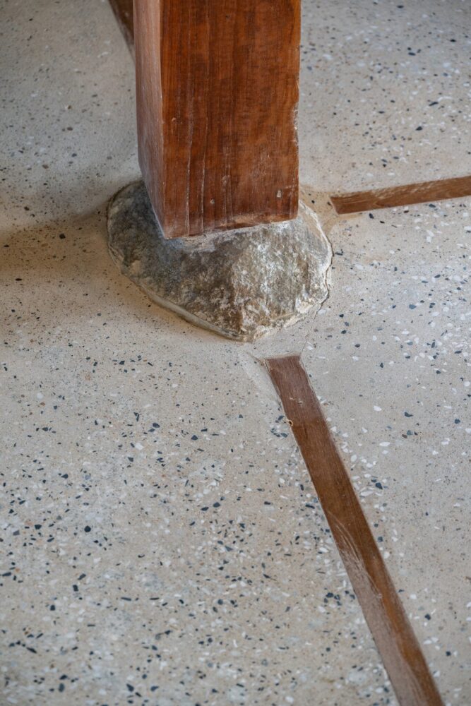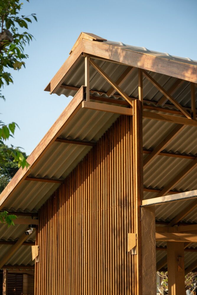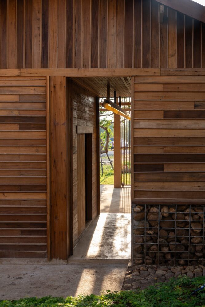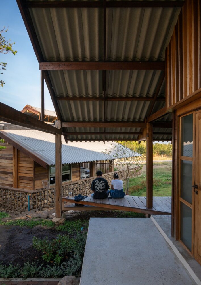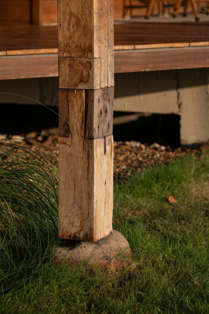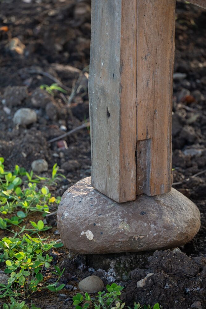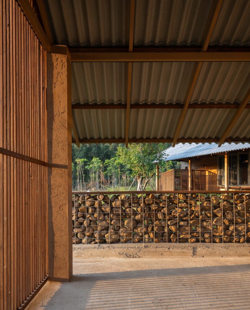 locally sourced stone serves as the base for the wooden columns, reflecting vernacular traditions