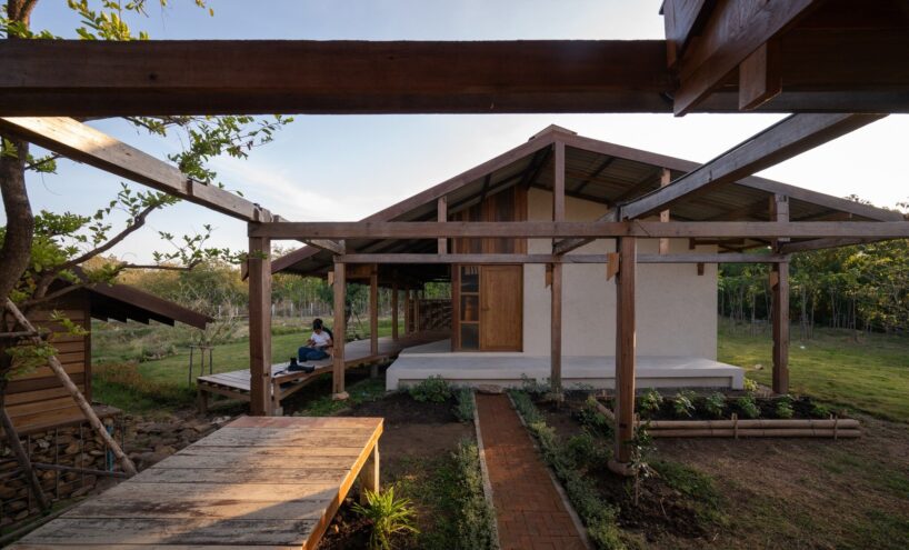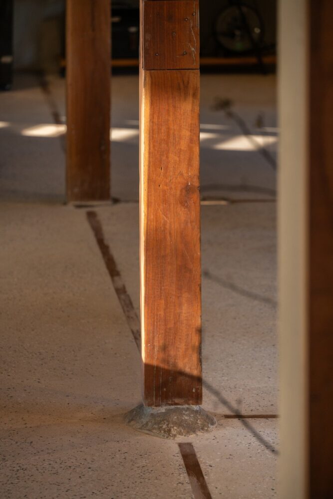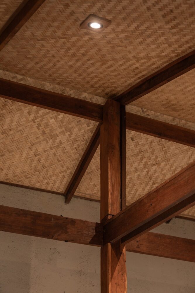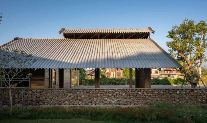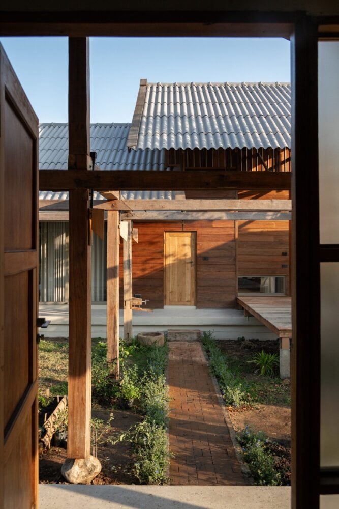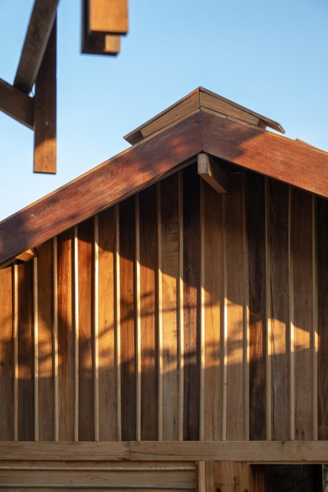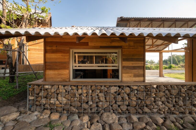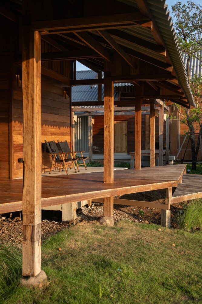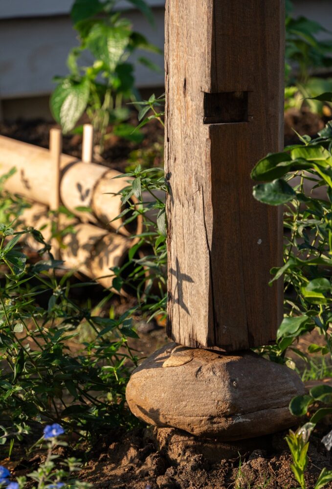 locally sourced stone serves as the base for the wooden columns, reflecting vernacular traditions