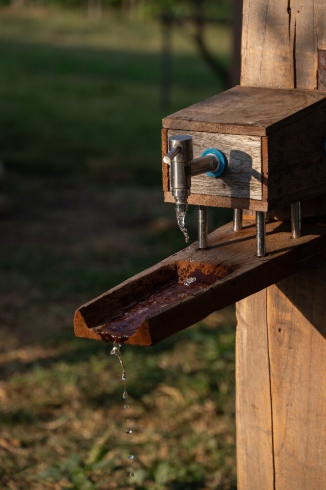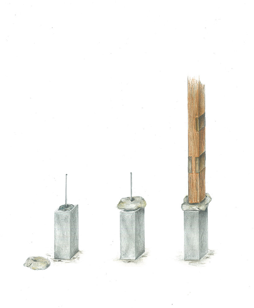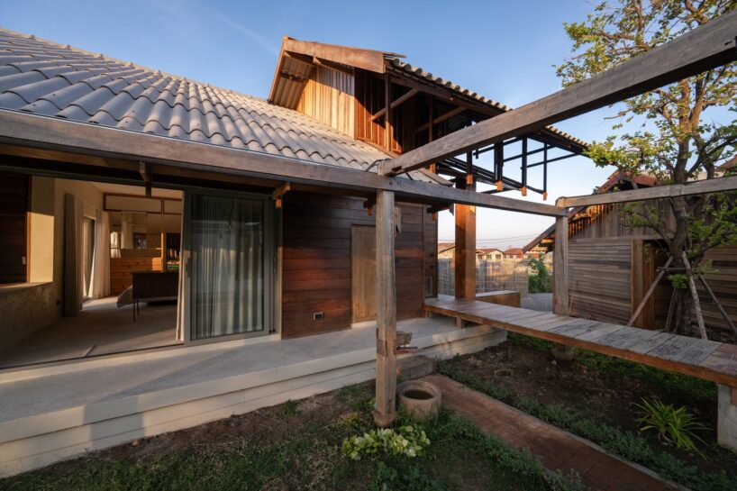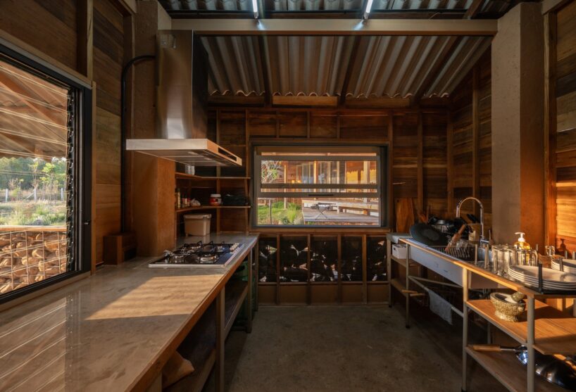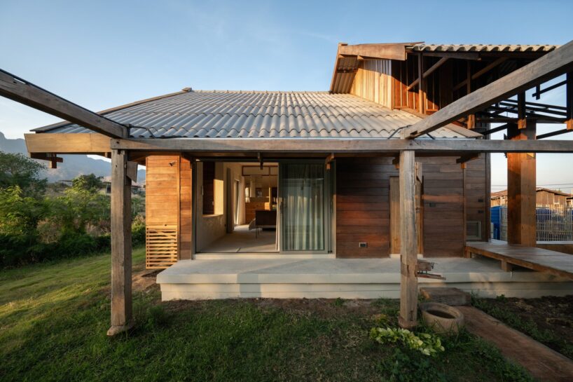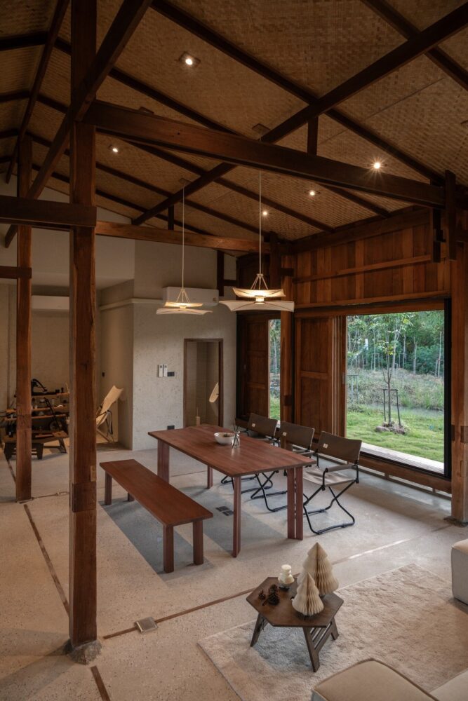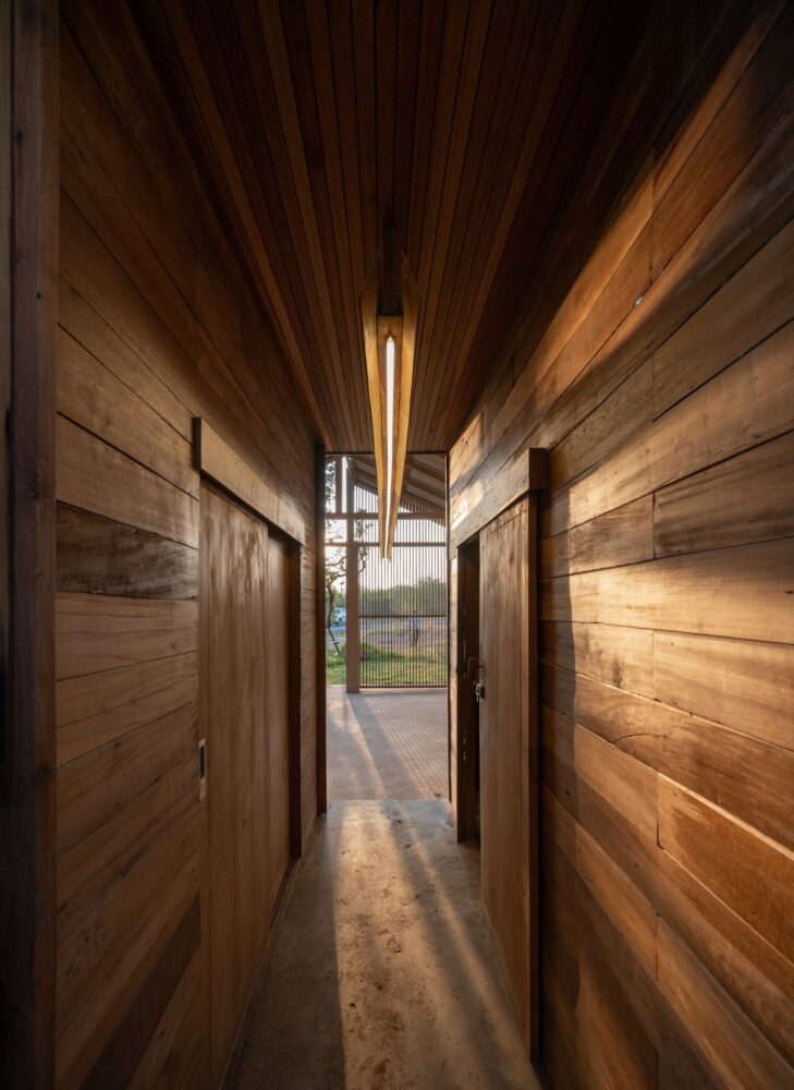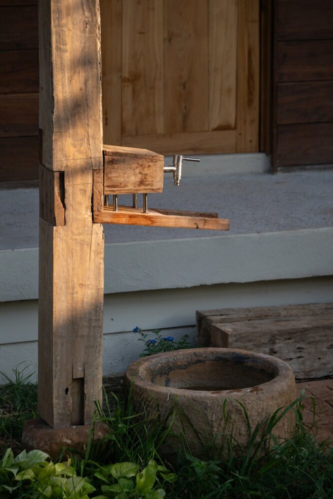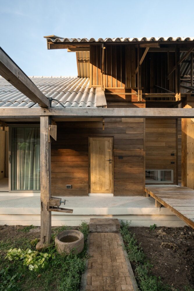 locally sourced stone serves as the base for the wooden columns, reflecting vernacular traditions