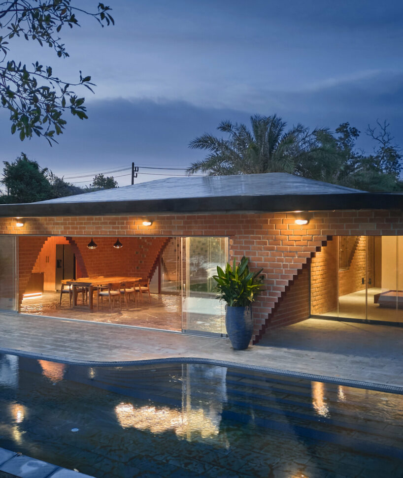 in the alloa hills of india, studio sangath's weekend home dissolves into the landscape through terracotta tones and an open courtyard plan.