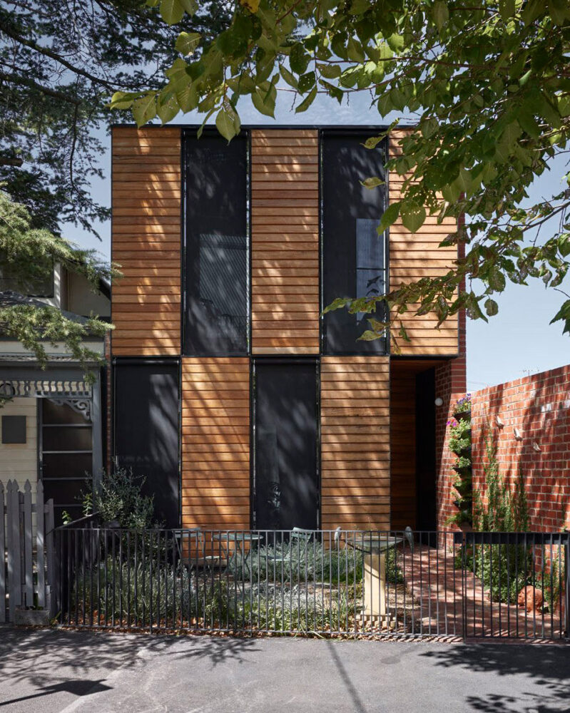the home is fossil-fuel-free with solar hot water, passive cooling, and hydronic heating