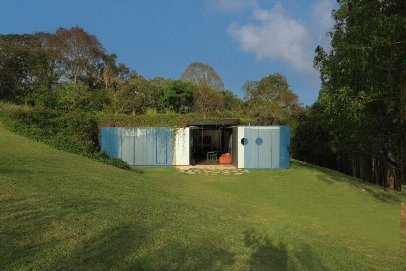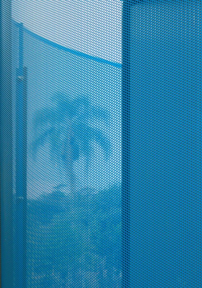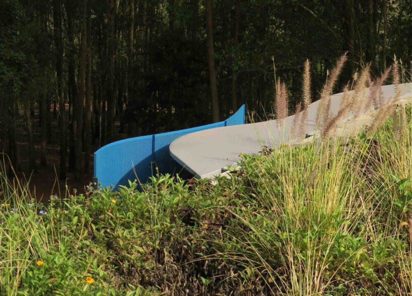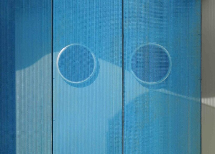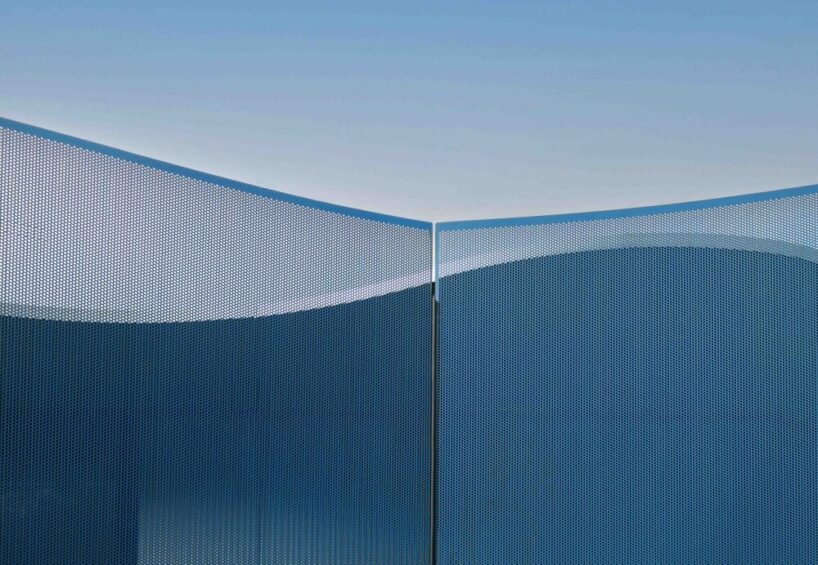blue perforated steel walls wrap the exterior in soft, sculptural gestures