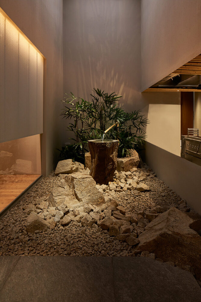 Guests enter the Suzuki restaurant at the Mondrian Singapore Duxton hotel through a stone-lined passage which opens into a warmly lit space lined with a teak floor. At the entrance is a 600kg piece of ancient Gifu stone that serves as the reception desk. To the side is a small nakaniwa, or internal courtyard garden, featuring a fountain made from a solid piece of Nagano stone, and a kakehi water feature, surrounded by rocks and pebbles, literally millions of years old, collected from Gifu. Overhead is a faux skylight that creates the illusion of an outdoor courtyard. During the service hours, the space is especially transformed when the skylight is dimmed to a soft glow to mimic twilight. Holding centre-stage in Suzuki is an L-shaped open kitchen where guests sit along a counter bench cut from a single plank of 150-year-old hinoki. This rare timber, harvested from the forests of Nagano, is essential to an authentic sushi experience at Suzuki, as its subtle woodsy note, says Kengo Kuma (see more here), harmoniously complements the taste of fresh fish.