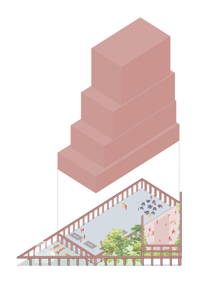 The plot’s compact, triangular shape raised additional challenges for this desire. ‘We embraced the plot’s shape and converted its challenge into the design bedrock. With this, we created the opportunity for not just a new landmark in the skyline, but especially an expressive public base, which arouses your curiosity as you pass by and gives back an attractive destination to the city,’ explains Vincent van der Klei, partner at Studioninedots. With that in mind, the resulting Highnote urban rooms — characterful yet as versatile as possible — become a new place to meet up, work, relax, and study, enabling users to adapt them as they see fit today and tomorrow.